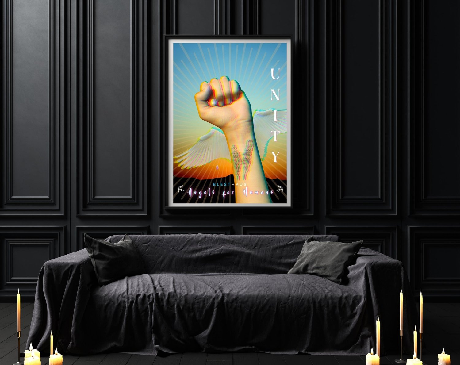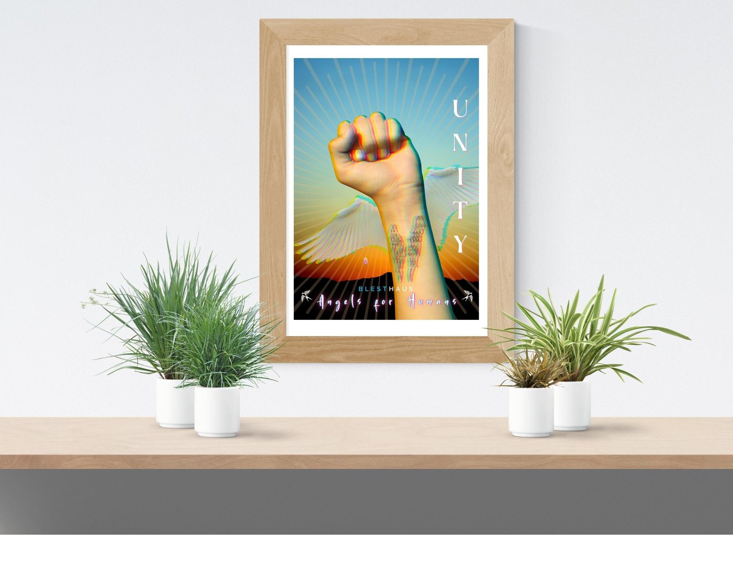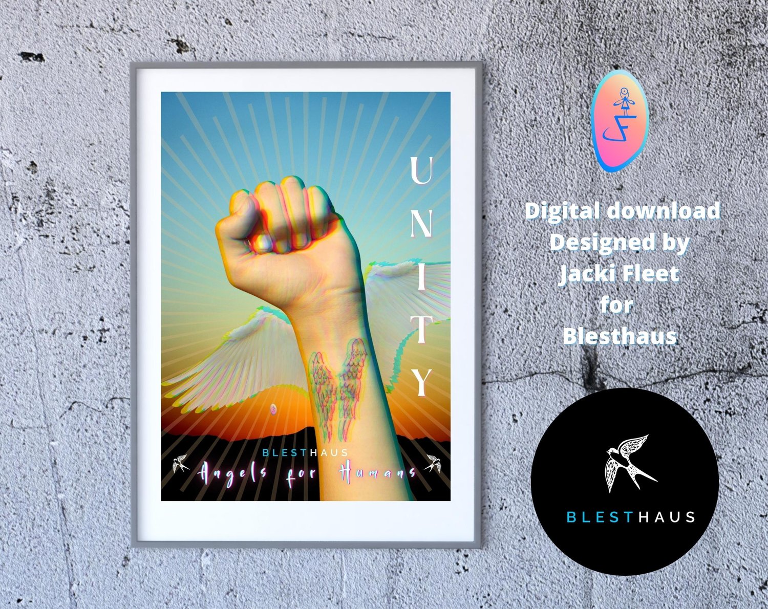 Unity - Together we are more powerful than we could imagine. Celebrating community and unity with wings and fists to the air. Angels walking side by side in unity, celebrating our community, our humanity, our divinity. We are One.